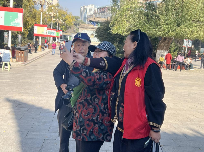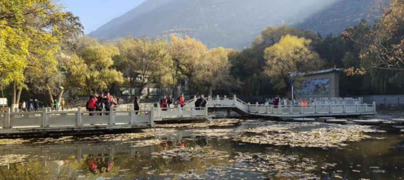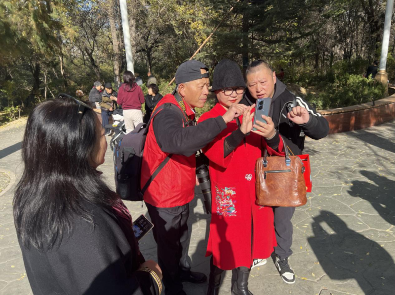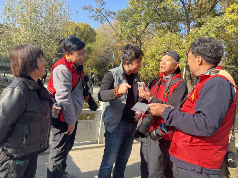深秋的五泉公园里市摄协的老师们与游客们分享摄影经验,边教学边拍摄,指导构图、用光等拍摄技巧,游客们认真学习,追美逐景,拍摄风光图片,记录美好生活。