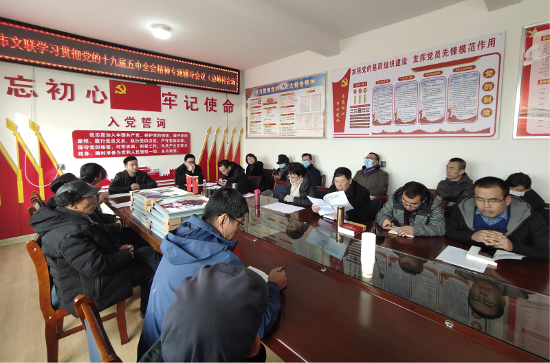 2020年12月8日,市文联机关全体党员干部深入边岭村开展党支部互联共建活动,组织开展学习贯彻党的十九届五中全会精神专题辅导会议。市文联党组书记、主席李晓华主持会议,通远镇副镇长苏生发、驻村工作队成员、村两委班子成员、部分党员群众代表参加会议。