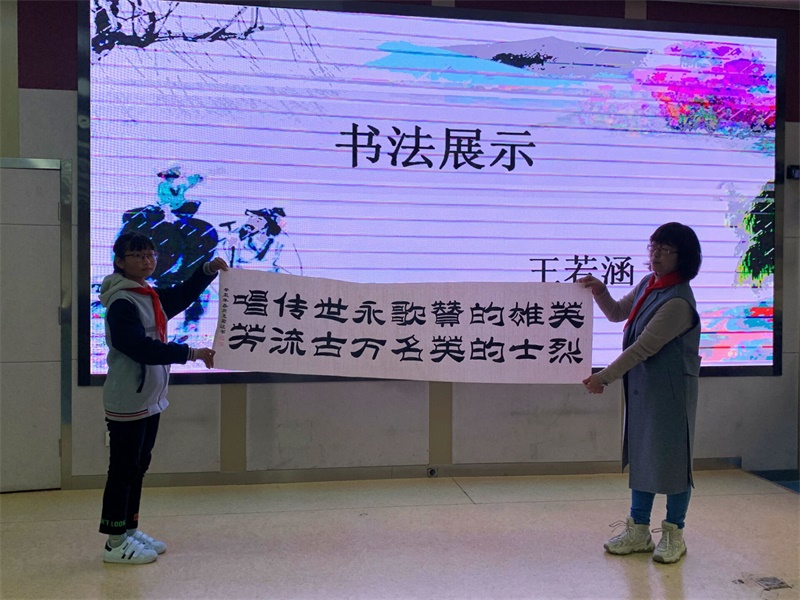 同时,秦安路小学学生也彰显着新时代少先队员们的文化积淀,他们朗诵了《杨靖宇的英雄事迹》《传承革命精神,做新时代好少年》等优秀篇目。期间,六年级学生二胡独奏的《英雄赞歌》将活动推向了高潮,学生现场“英雄的赞歌永世传唱,烈士的英名万古流芳”的书法作品,也展现了青少年对书法艺术传承的风采。