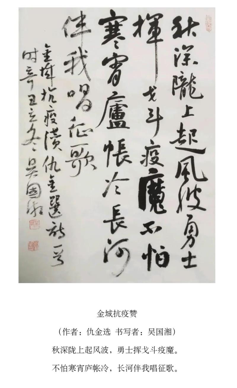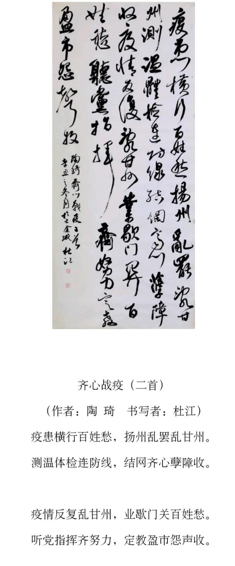 为深入贯彻落实习近平总书记关于疫情防控工作的重要指示精神,体现我市广大书法工作者在疫情面前的责任和担当,金年会官方在线入口网站 、兰州市书法家书法家协会号召广大书法工作者、爱好者用手中的笔墨助力疫情防控的宣传,创作出鼓舞气势、凝聚人心的正能量书法作品,助力兰州早日战胜疫情。