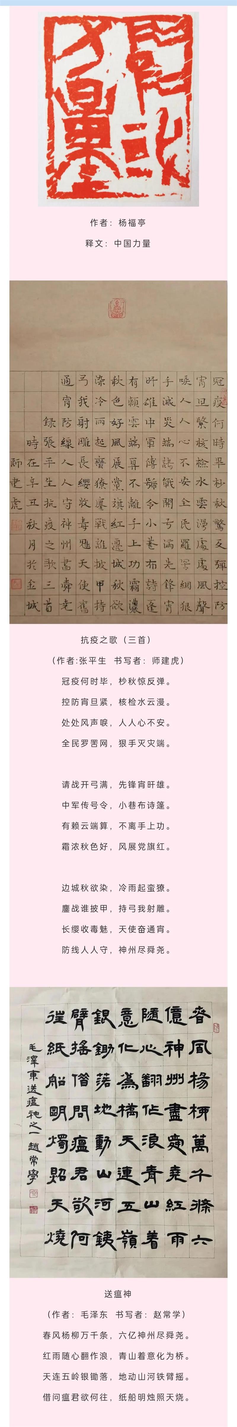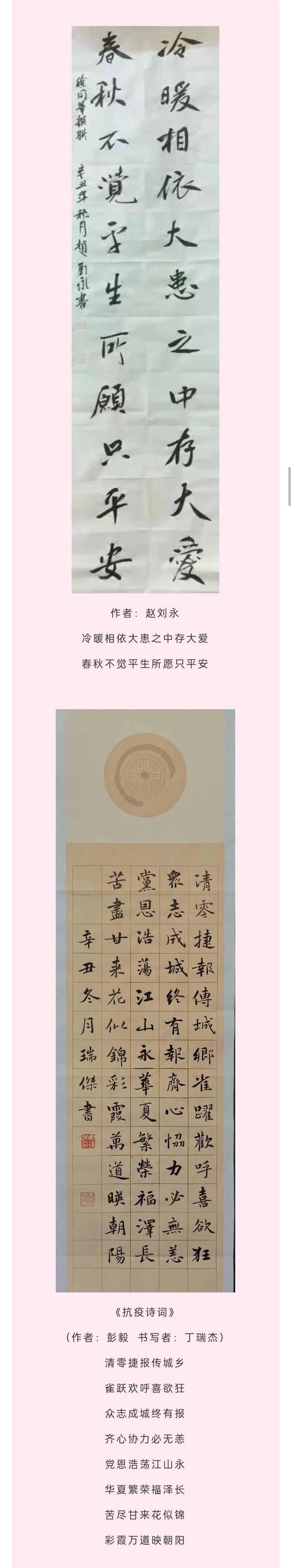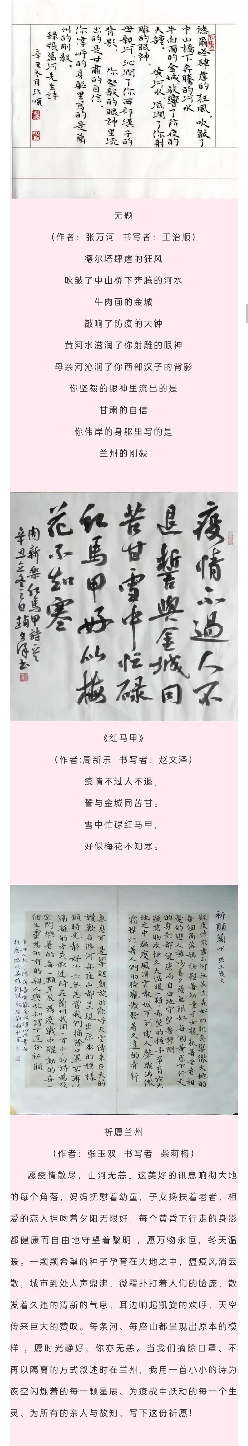 为深入贯彻落实习近平总书记关于疫情防控工作的重要指示精神,体现我市广大书法工作者在疫情面前的责任和担当,金年会官方在线入口网站 、兰州市书法家书法家协会号召广大书法工作者、爱好者用手中的笔墨助力疫情防控的宣传,创作出鼓舞气势、凝聚人心的正能量书法作品,助力兰州早日战胜疫情。