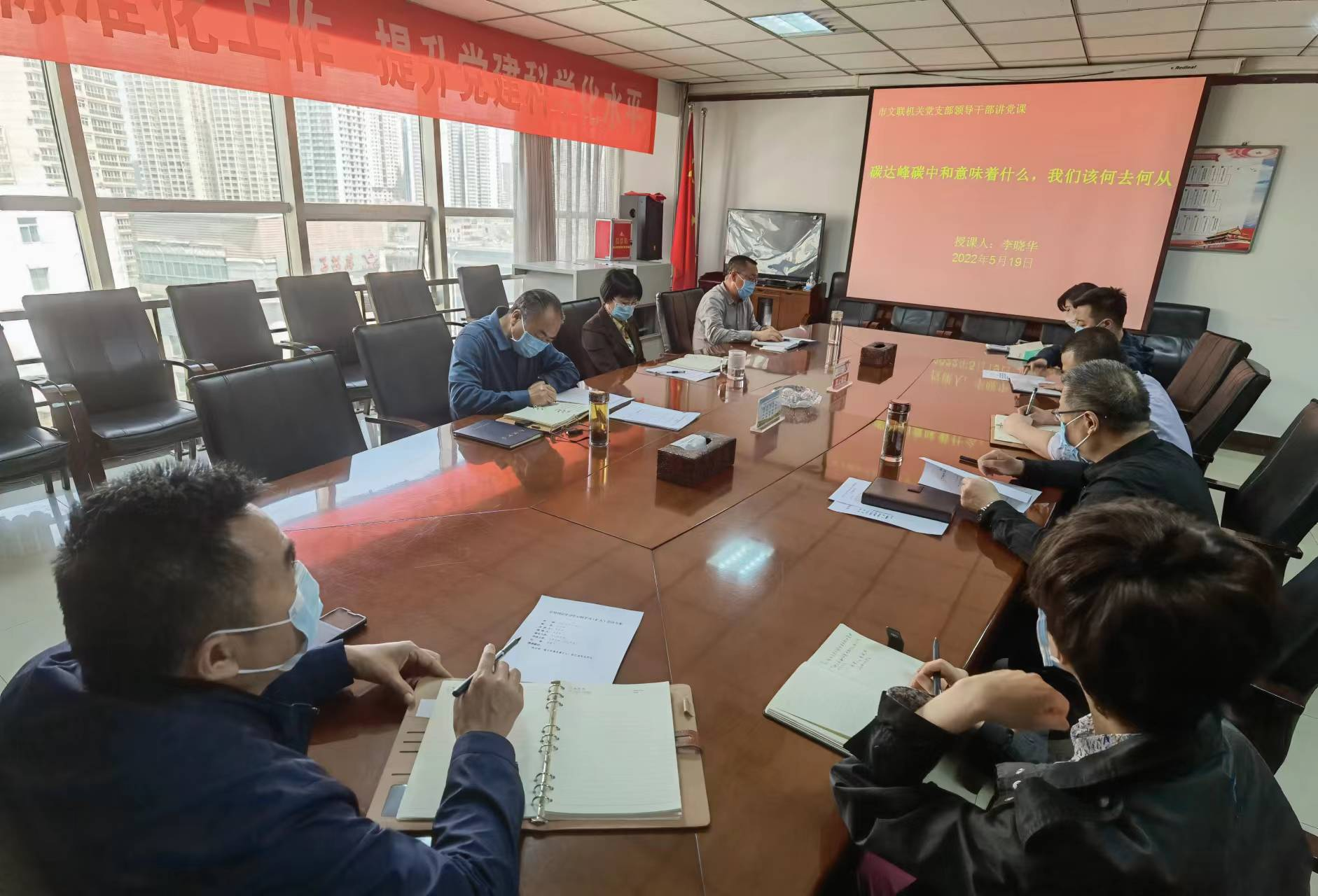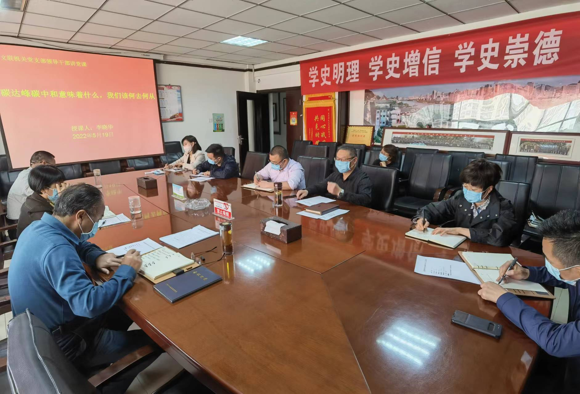 为开展好“垃圾分类、环保文明、绿色发展”主题宣传活动,5月19日,市文联党组书记、主席李晓华作了题为“碳达峰、碳中和意味着什么,我们该何去何从”的专题党课,党组中心组成员、机关党支部全体党员、中层领导干部、各协会负责人参加。