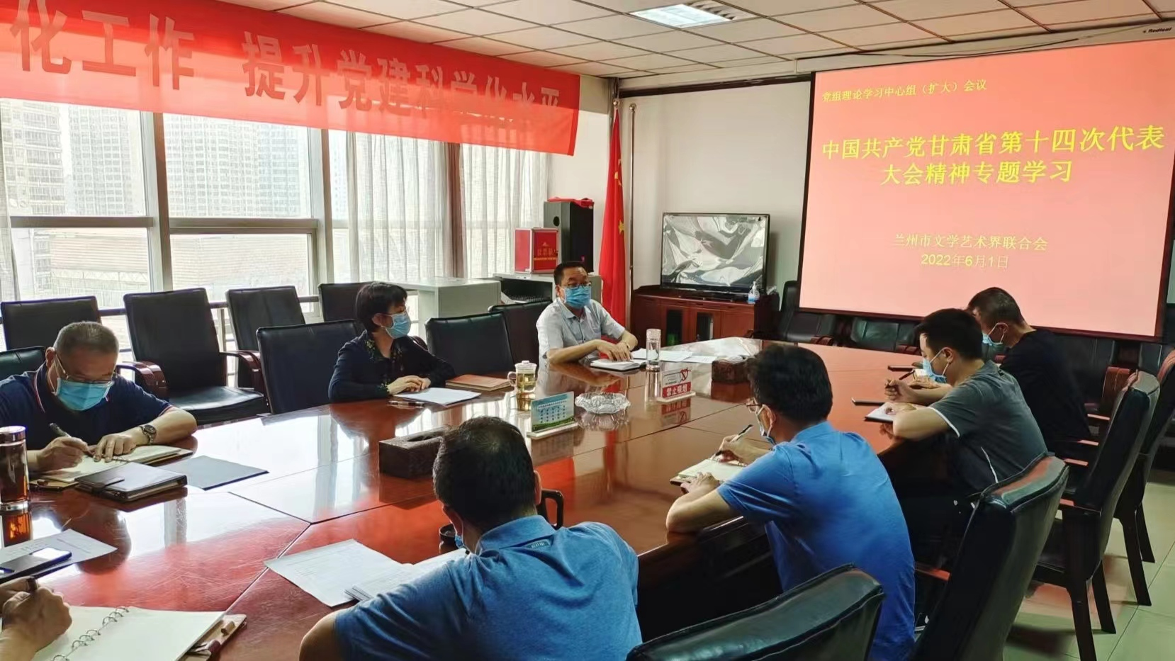 2022年6月1日上午,金年会官方在线入口网站 召开党组理论学习中心组学习(扩大)会议,专题学习贯彻省第十四次党代会精神。市文联党组理论学习中心组成员、中层干部、各协会负责同志参加会议。