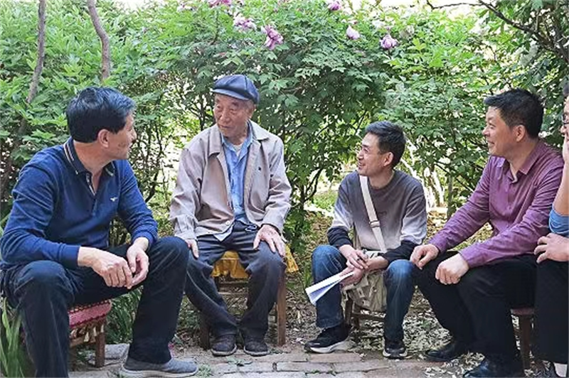“中国紫斑牡丹之父”陈德忠(左二)与作者梁卫忠(左三)一行座谈,讲述自己五十年紫斑牡丹培育之路