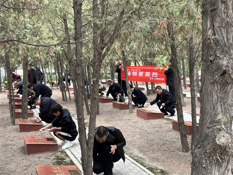 随后,全体党员干部来到兰州战役中牺牲的无名烈士墓地,通过为烈士擦拭墓碑、敬献鲜花等方式,“探望”无名烈士亲人,让无名烈士墓前鲜花常有、墓碑常亮、追思常在。