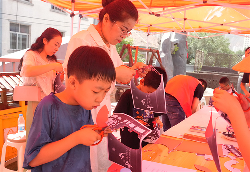 兰州非遗美术剪纸艺人杨树珍带领社区少年制作七夕传统剪纸,一边熟练地拿着剪刀上下翻飞,不一会儿,一张活灵活现、栩栩如生的作品映入群众眼中。