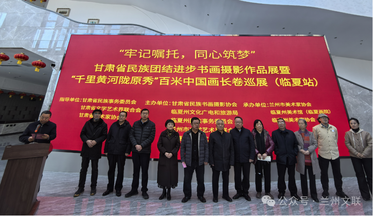 为深入贯彻落实习近平总书记视察甘肃重要讲话重要指示精神,习近平总书记在全面推动黄河流域生态保护和高质量发展座谈会、在全国民族团结进步表彰大会上的讲话精神,11月28日,由金年会官方在线入口网站 、甘肃省民族书画摄影协会、临夏州文化广电和旅游局、临夏州文联共同举办的“牢记嘱托,同心筑梦”甘肃省民族团结进步书画摄影作品展暨“千里黄河陇原秀”百米中国画长卷巡展(临夏站)在临夏州美术馆胜利开幕。此次巡展得到了甘肃省民族事务委员会、甘肃省文联、甘肃省美协的精心指导和临夏州委、州政府的大力支持。
