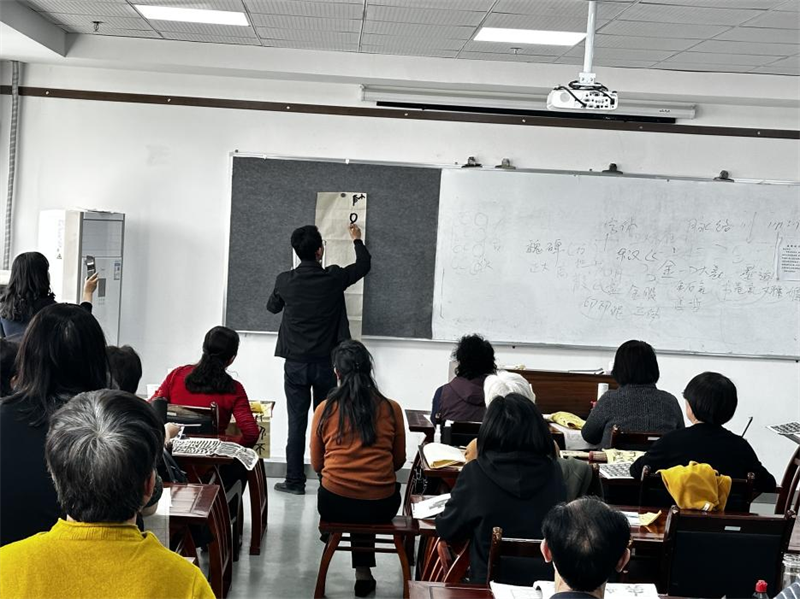 公益讲座采用“双轨并行“模式,每周四下午,在抱一书法篆刻馆由市书协副主席兼秘书长郎照玉主讲《书法临创转换》系列课程,系统解析隶书、楷书、行草书的临帖技巧与创作转化,课程吸引百余名书法爱好者参与。每周日下午,在省老年大学由市书协骨干会员师建虎主讲《中国书法鉴赏与技法》专题,通过经典作品赏析、金文技法解析和章法布局教学,为众多中老年学员带来专业指导。