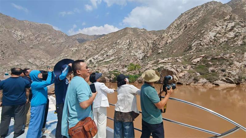 活动中,艺术家们乘船沿黄河大峡谷旅游廊道一路前行,先后探访了峡谷峭壁、古渡口、峡谷瀑布、水文遗迹等特色点位。大家在船头驻足观景,近距离感受黄河奔流不息的磅礴气势,细致观察峡谷两岸的地质风貌与人文遗存,不时交流感悟、记录素材。