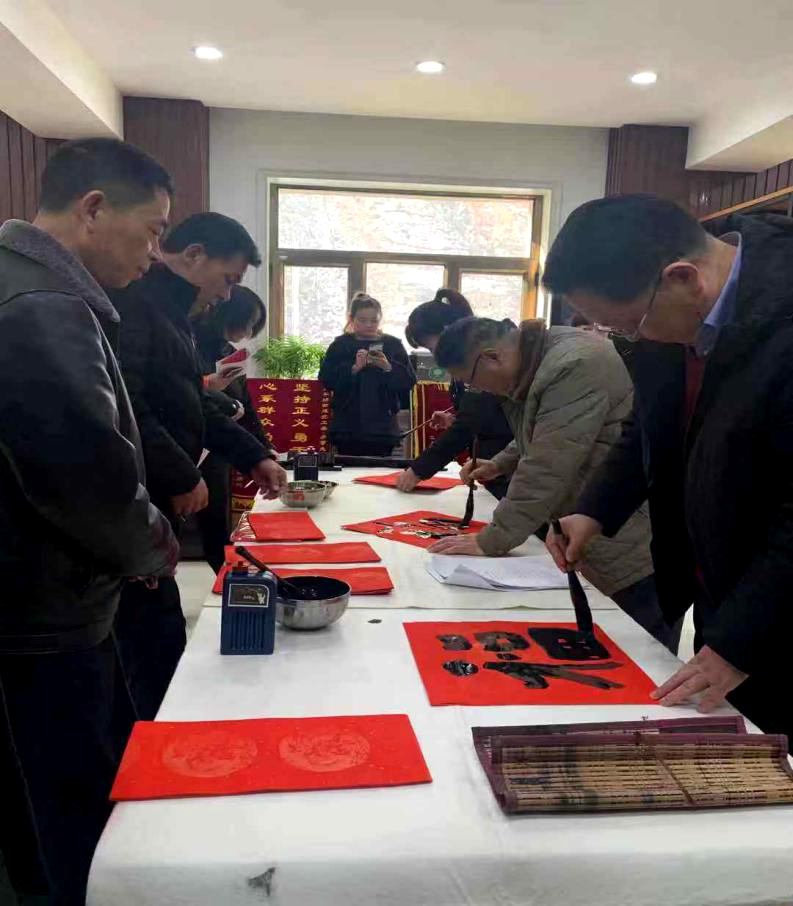 座谈会后,文艺家、文艺工作者与社区书画爱好者,现场挥毫泼墨,为社区群众写“福”字,写春联。金年会官方在线入口网站 机关党支部专职副书记周羿廷同志现场为社区创作六尺水墨国画《荷花情》、《四春图》。